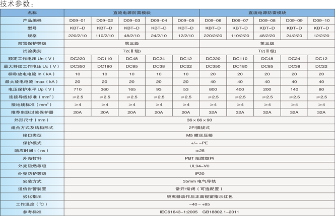 KBT-D系列直流电源防雷模块为分体式结构,可插拔,带劣化指示窗口。用于直流电源第三级防护,标准35mm导轨安装。适用于通信系统、监控系统和工业自动化系统的过电压保护。