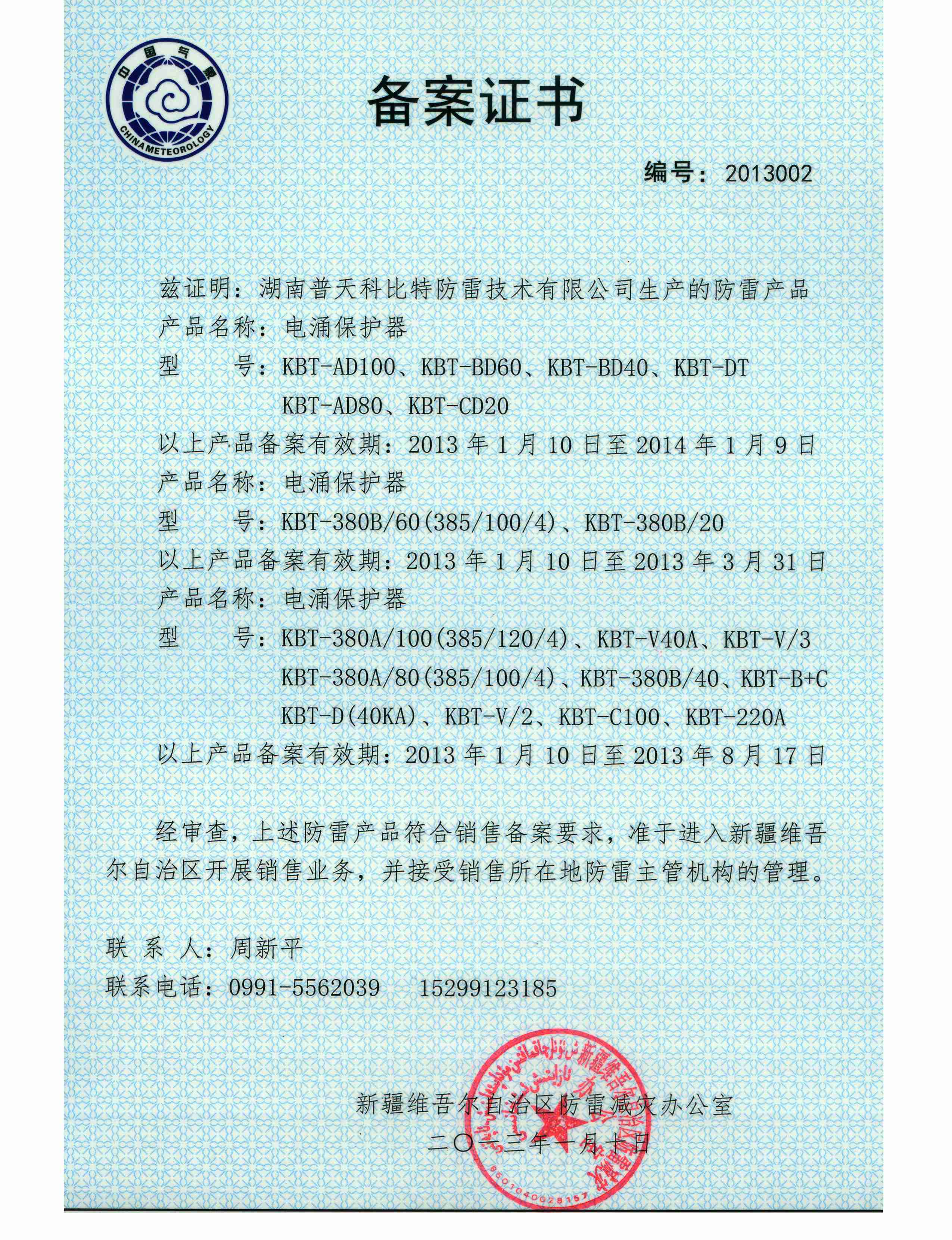 经审查,同意湖南普天科比特防雷技术有限公司生产的防雷产品进入新疆维吾尔自治区开展销售业务。