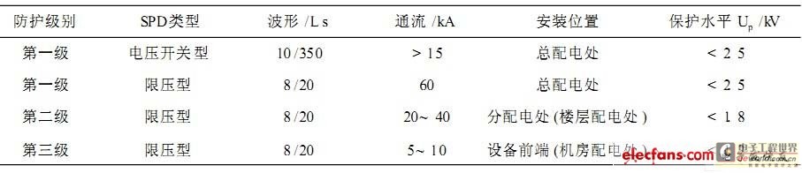 防护级别SPD类型波形/μs通流/kA安装位置保护水平Up/kV第一级电压开关型10/350 >15总配电处<2. 5第一级限压型8/20 60总配电处<2. 5第二级限压型8/20 20~40分配电处(楼层配电处) <1. 8第三级限压型8/20 5~10设备前端(机房配电处) <1. 2按照规范要求,电源第一级SPD安装在建筑物电气装置的电源进线处。一般情况下,应选择电压开关型SPD,但如果该处电源线路全部有良好的屏蔽(如穿金属管、埋地)进入,则可以选用限压型SPD。电压开关型SPD与限压型SPD之间的线路长度不宜小于10 m,限压型SPD之间的线路长度不宜小于5 m。如果小于规定的长度,则应在两级SPD之间串联加装去耦电感。由于SPD的最大浪涌电压为其保护电压Up+UL(SPD两端引线的感应电压),因此为使SPD最大的电涌电压足够低,其两端的引线应最短,一般不超过0. 5 m。