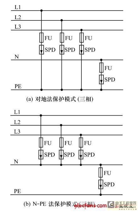 SPD安装在线路中,当有过电压或过电流出现时, SPD将对地导通,实现对地分流,从而达到间接等电位的目的。对于不同的接地系统, SPD的接线方法不一样,一般有对地法和N-PE法两种保护,如图1所示。除TT系统SPD安装在剩余电流保护器的电源侧必须用N-PE法以外,一般均使用对地法。