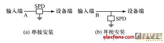 随着信息系统的广泛应用,由于网络线路多,电子设备的耐压水平低,雷击对信息系统的危害越来越大。雷电对信息系统的危害主要是雷击电磁脉冲造成的,包括沿线路传导的雷电过电压波、雷电流在接地线产生的高电位反击、雷击电磁场的静电感应和电磁感应。对电磁脉冲的防护措施有拦截、分流、等电位联结、屏蔽、接地、合理布线等。在信号线路上安装SPD是信息系统防电磁脉冲的一个重要措施,它可以同时起到拦截、分流、等电位联结的作用。信号线路SPD应连接在被保护设备的信号端口上。其输出端与被保护设备的端口相连,有串接和并接之分(见图2),一般是串联安装在信号线路上。因此,在选择信号SPD时,应选用插入损耗较小的SPD。