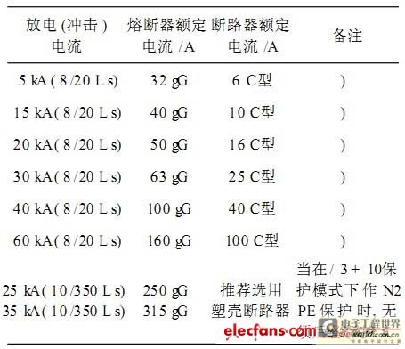 目前多数SPD产品选择熔断器、微型断路器做其后备保护,其额定电流的选择可参照表2。