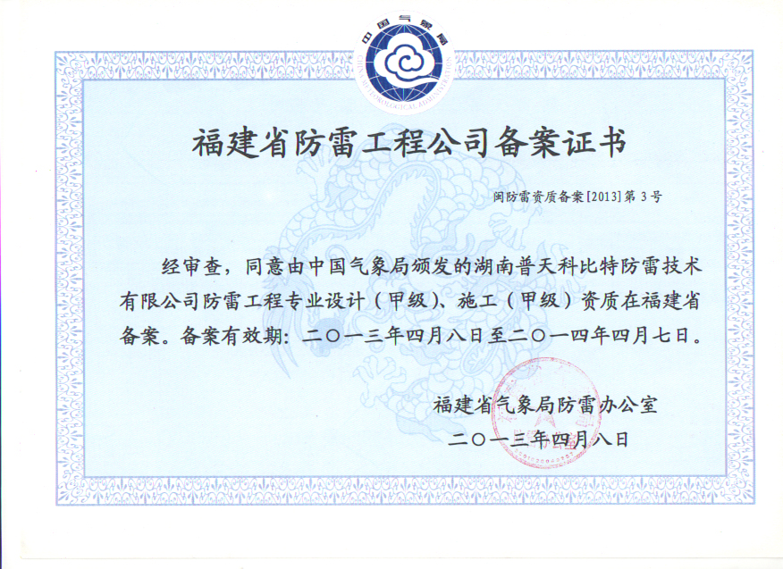 经审查,同意由中国气象局颁发的湖南普天科比特防雷技术有限公司防雷工程专业设计(甲级)、施工(甲级)资质在福建省备案。