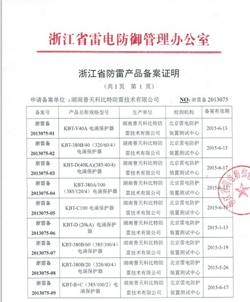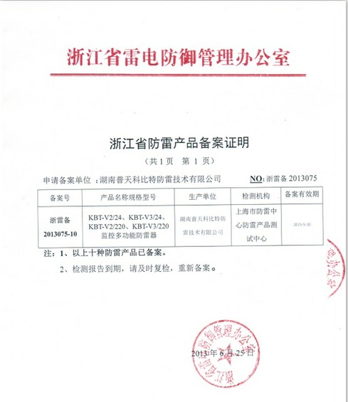 2013年6月25日,科比特防雷产品在浙江省续备案了两个产品系列:电涌保护器、监控多功能防雷器。以下是相关备案证明: