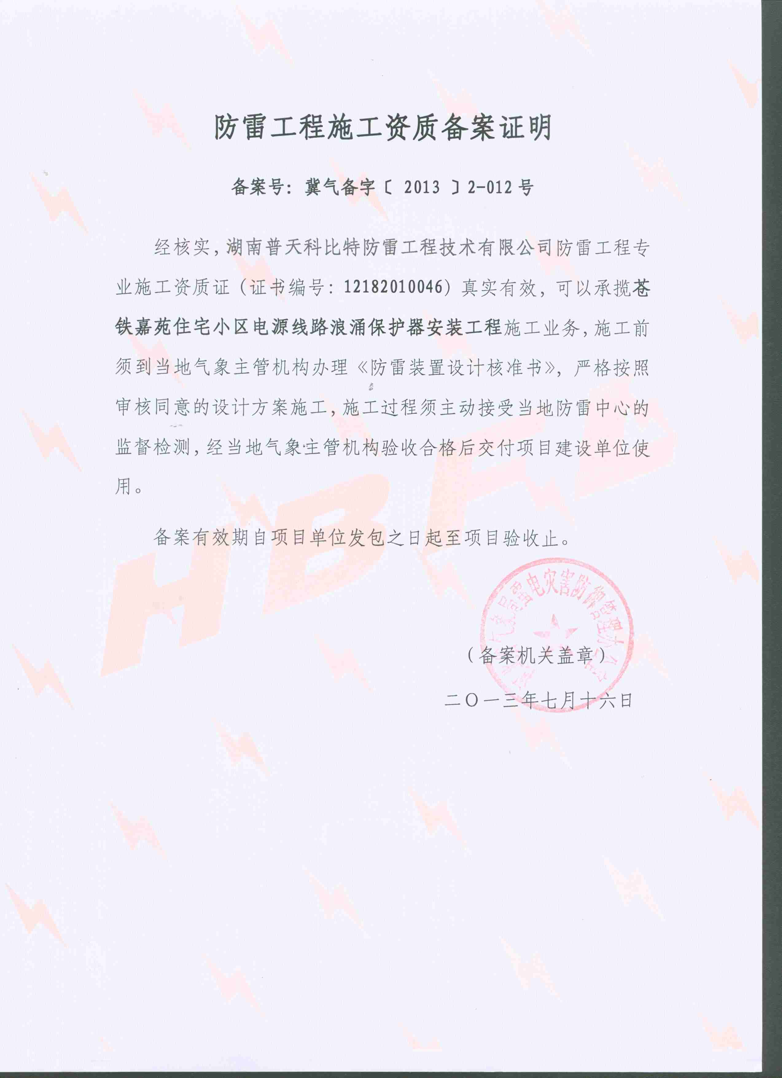 科比特河北省防雷产品防雷工程施工资质续备案证书