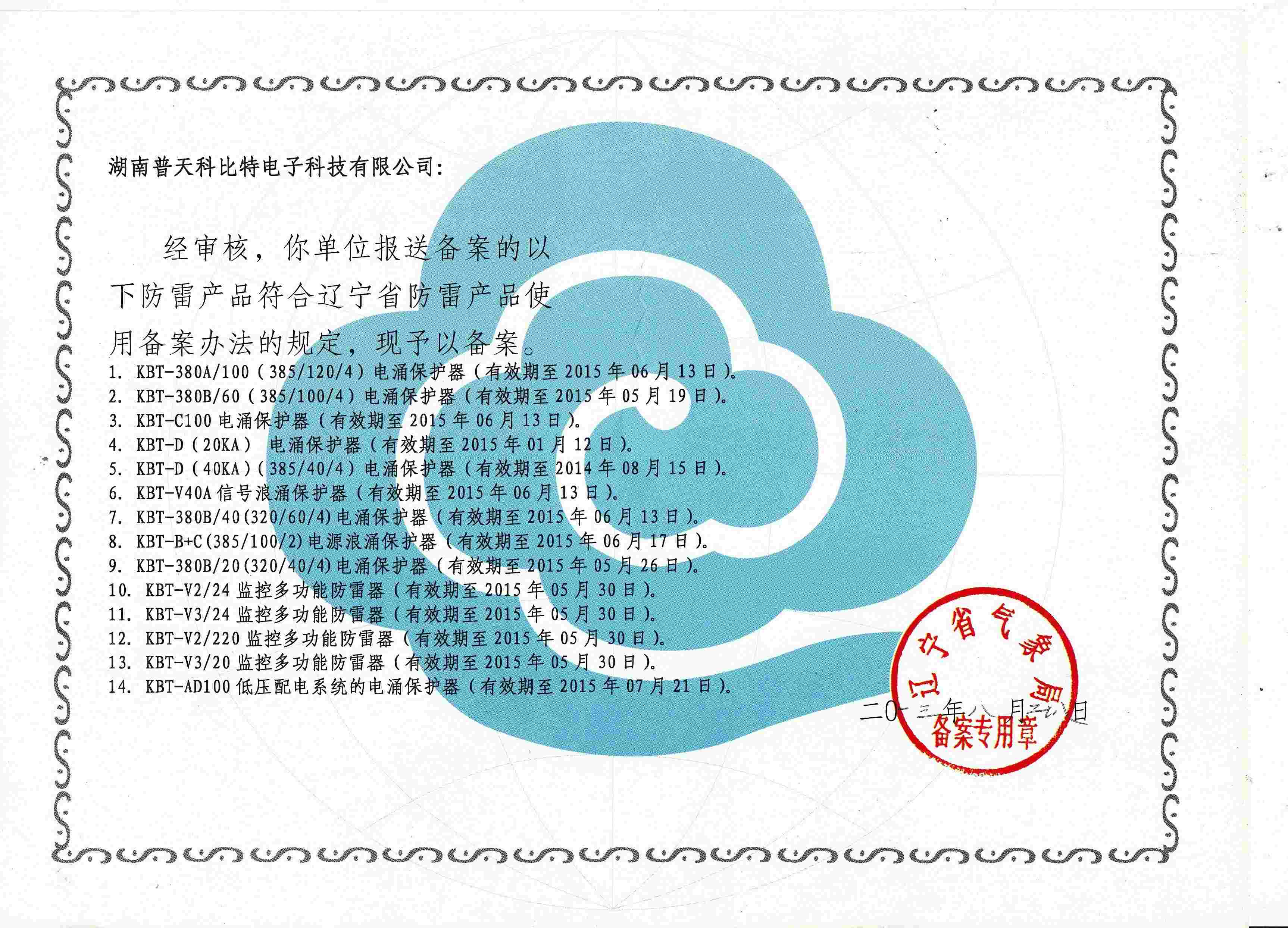 经审核,湖南普天科比特电子科技有限公司报备的防雷产品,予以备案。此次备案的产品有: