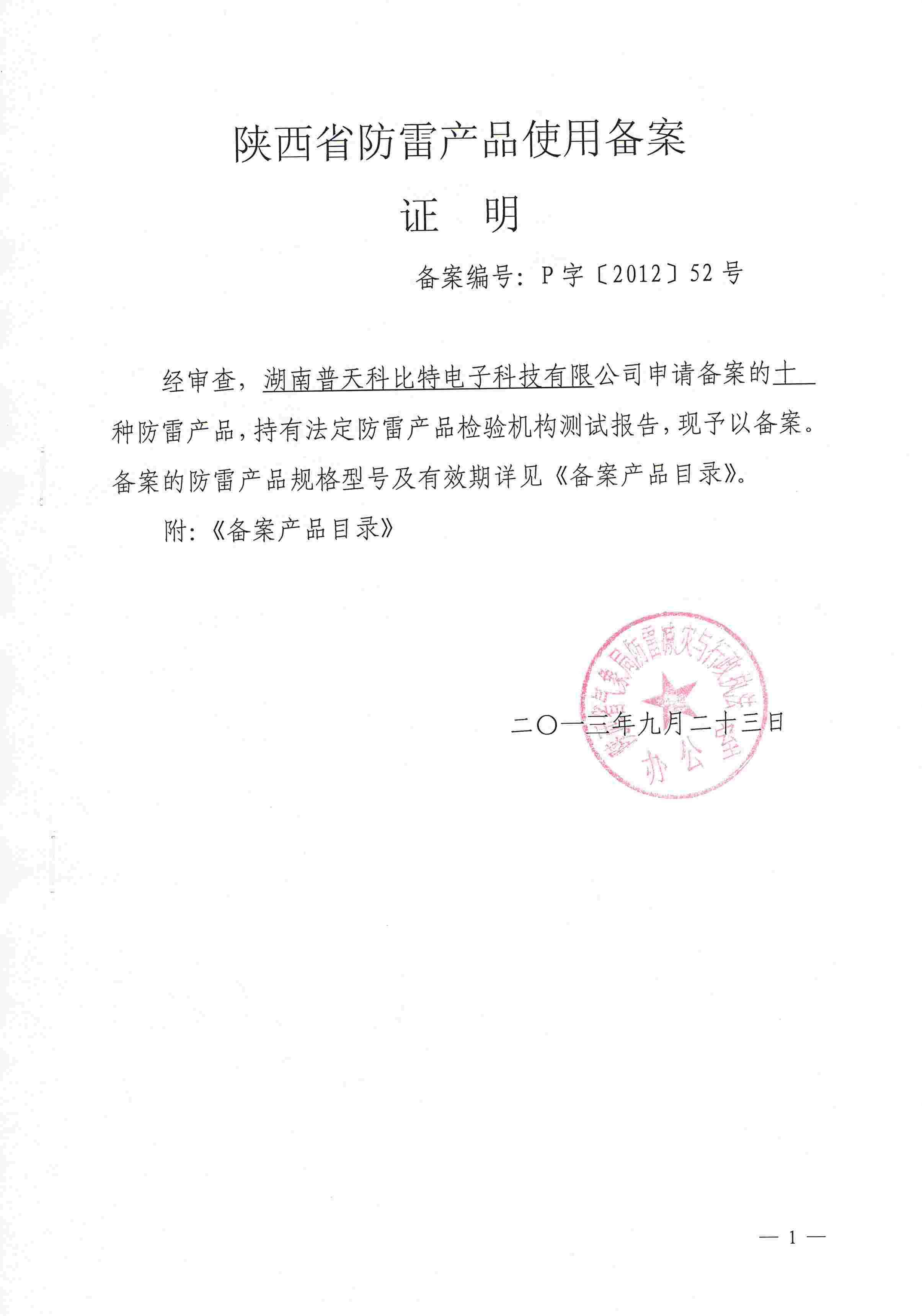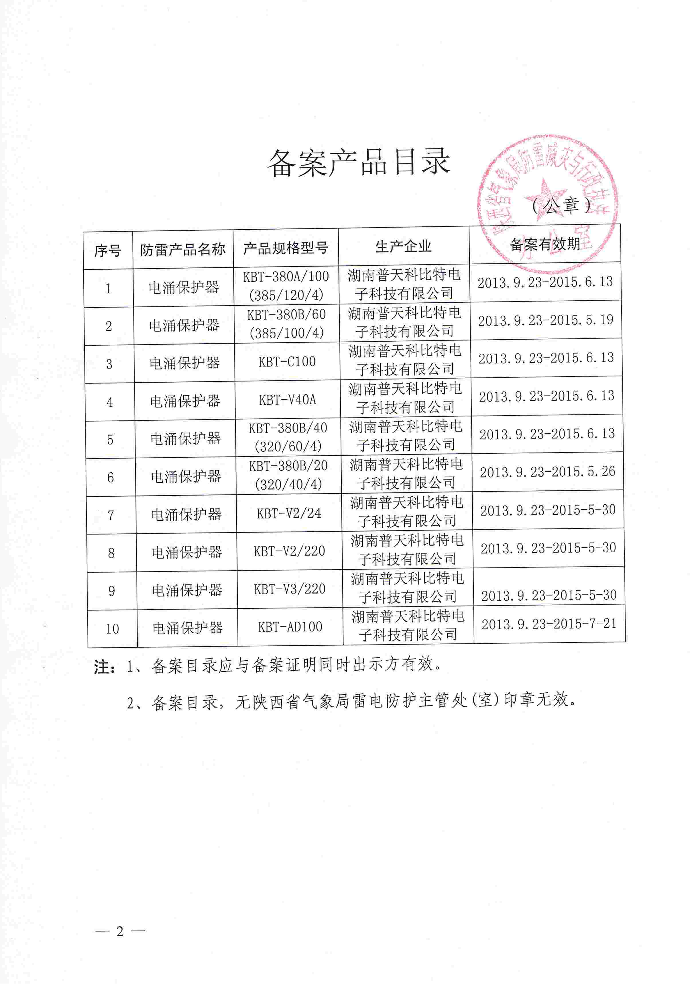 经审查,湖南普天科比特电子科技有限公司申请备案的十种防雷产品,持有法定防雷产品检测机构测试报告,现予以备案。