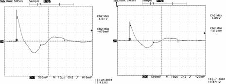 图1-3 5kA(左)、3kA(右)的8/20us冲击电流下1米长导线两端压降(衰减500倍)