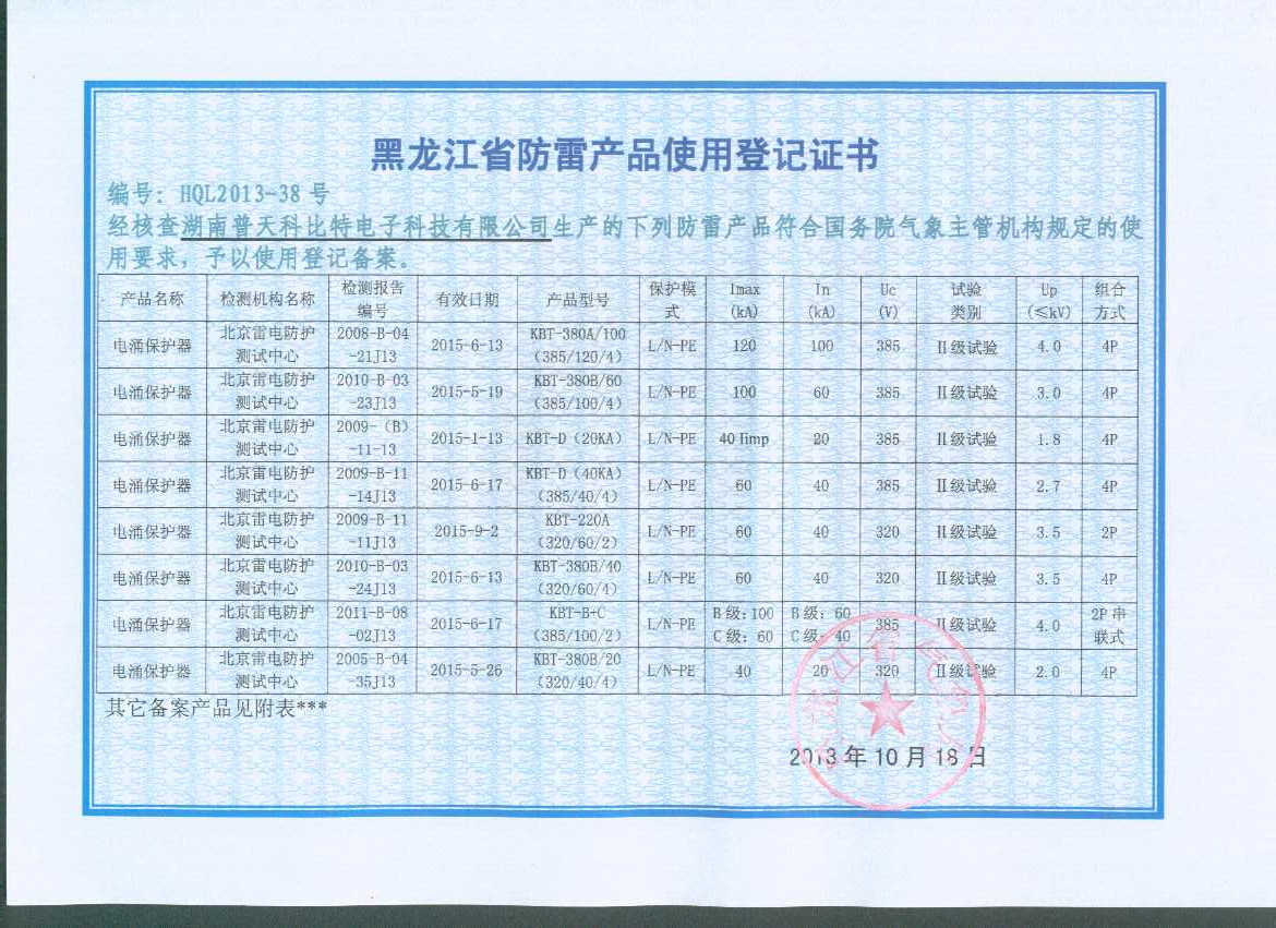 经核查湖南普天科比特电子科技有限公司生产的下列防雷产品符合国务院气象主管机构规定的使用要求,予以使用登记备案。此次备案的防雷产品:浪涌保护器系列、监控多功能防雷器系列。