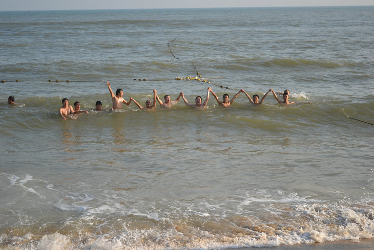 第二天吃过早饭就直奔大海了。前往的第一站是最大的开放式海滨公园——“海陵岛国家海洋公园”。蔚蓝的天空和湛蓝的海水在远方连成一线,一排排白色的浪花一遍遍冲刷着岸边的细沙,每个人享受在蓝天、白云、大海的环绕中。在这里,公司以蓝天大海为背景,以沙滩为场地,留下了第一张大合照,每个人笑靥如花的脸上洋溢着幸福的表情。大家卷起裤脚,脱掉鞋袜,在沙滩和海中尽情玩耍,有的踢着浪花,在海里嬉戏;有的踩着海沙漫步;有的坐在沙滩上享受阳光的沐浴,呼吸着大海的味道;有的将自己埋在沙子里供人玩乐。各有乐趣。在海洋公园停留了1个小时候就前往拥有世界吉尼斯之最的十里银滩了。