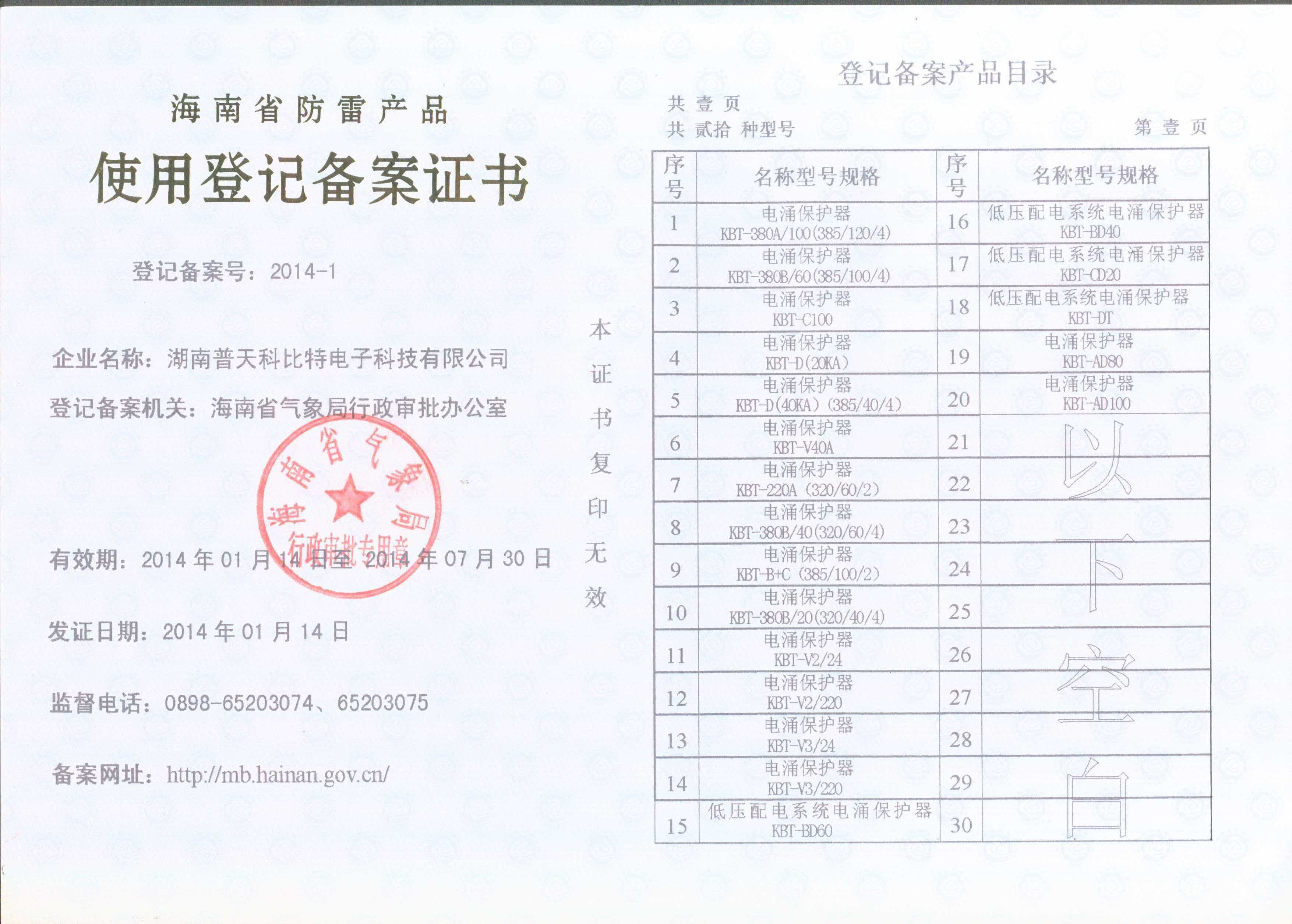 科比特海南省防雷产品备案证明
