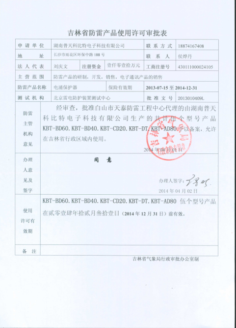 科比特吉林省防雷产品续备案证明