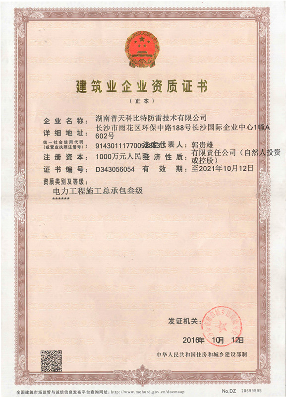 2016年10月12日,湖南普天科比特防雷技术有限公司成功获得市建委颁发的《建筑业企业资质证书——电力工程施工总承包叁级》。这是一个令人振奋的消息,该资质证书的获取意味着科比特防雷迈向一个更高水平,具有综合实力的电力工程施工总承包商。