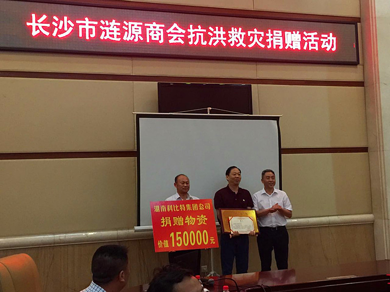 2017年6月22日至7月1日,涟源市遭遇了百年不遇的特大洪涝灾害。全市28.8万人受灾,因灾转移安置受灾群众2万余人,工农业生产和电力、交通、通讯等基础设施严重毁损,经济损失惨重。2017年8月2日下午,涟源市在长沙市九所宾馆会议中心举行长沙市涟源商会向涟源市抗洪救灾捐赠仪式。捐赠仪式由涟源市委常委、市委统战部长王澍主持。涟源市委副书记、市人民政府市长刘杰,市政协主席贺顺清,市工商联主席谢湘和等领导出席,湖南科比特集团股份有限公司董事长郭贵雄代表参加了此次活动。