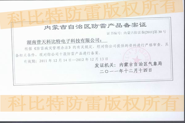 经审查,同意湖南普天科比特电子科技有限公司申请备案的防雷产品备案。