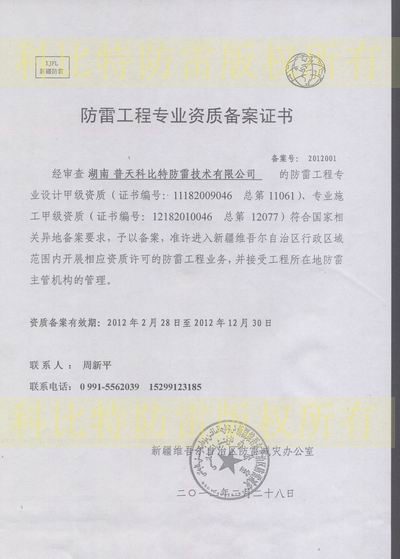 湖南普天科比特防雷技术有限公司防雷工程专业设计甲级资质证编号:11182009046),总第11061,有效期至2012年10月29日; 施工甲级资质证编号12182010046,总第12077,有效期至2012年12月30日已按规定程序在新疆气象主管机构进行防雷工程专业设计、施工等级备案。有效期自2012年02月28日至2012年12月30日。