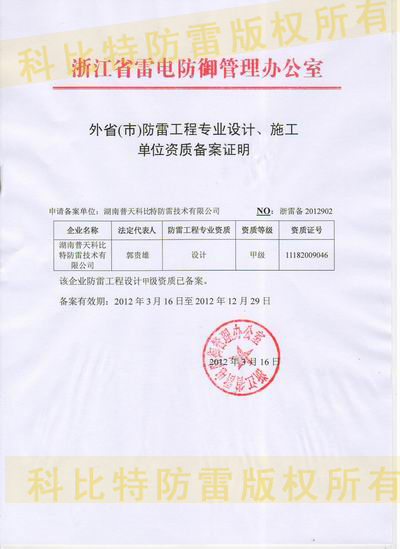 湖南普天科比特防雷技术有限公司防雷工程专业设计甲级资质证编号:11182009046),总第11061,有效期至2012年12月29日已按规定程序在浙江省气象主管机构进行防雷工程专业设计、施工等级备案。有效期自2012年03月16日至2012年12月29日。