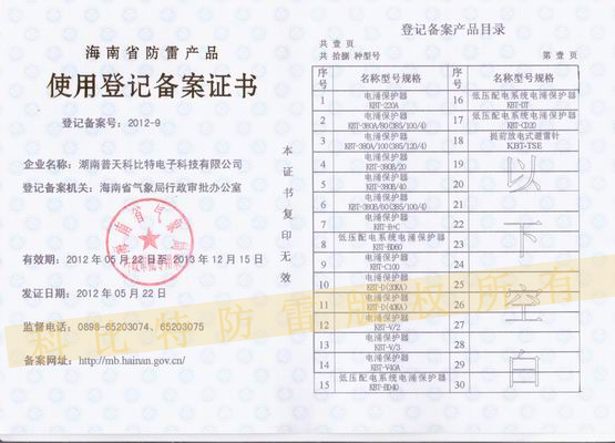 经审查,同意湖南普天科比特电子科技有限公司申请备案的防雷产品备案。