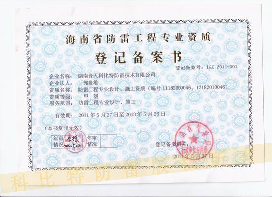 湖南普天科比特防雷技术有限公司防雷工程专业设计甲级资质证编号:11182009046),总第11061,有效期至2013年05月26日已按规定程序在海南省气象主管机构进行防雷工程专业设计、施工等级备案。有效期自2012年05月27日至2013年05月26日。