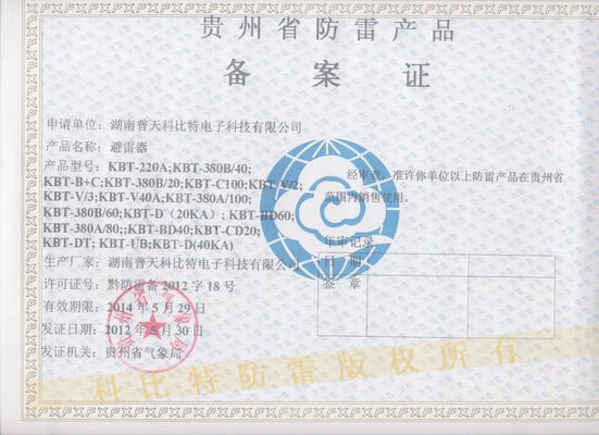 经审查,同意湖南普天科比特电子科技有限公司申请备案的防雷产品备案。