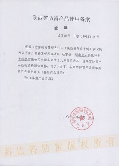 经审查,同意湖南普天科比特电子科技有限公司申请备案的防雷产品备案。
