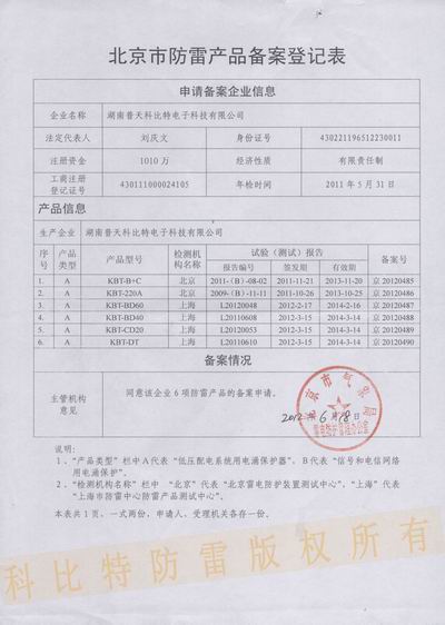 科比特防雷产品北京市最新备案证明: