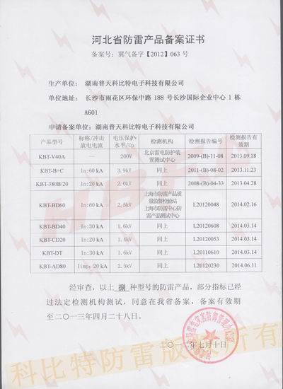 经审查,同意湖南普天科比特电子科技有限公司申请备案的防雷产品备案。