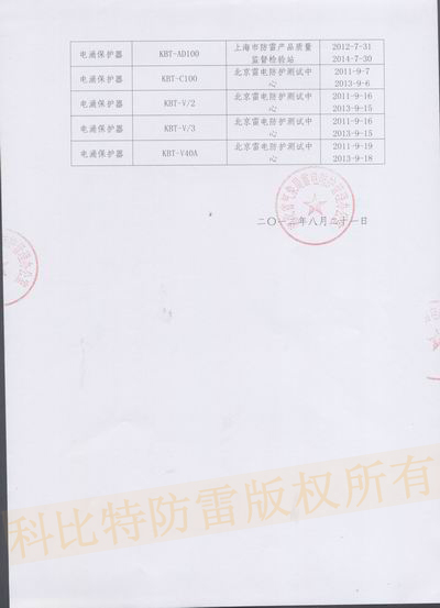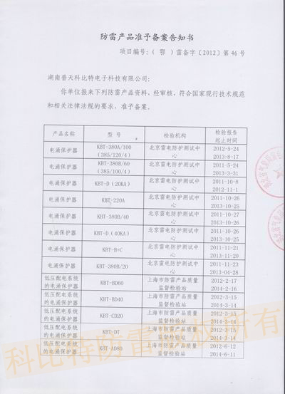 经审查,同意湖南普天科比特电子科技有限公司申请备案的防雷产品备案。