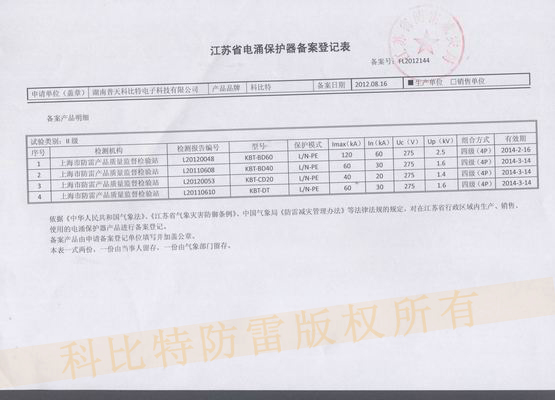 经审查,同意湖南普天科比特电子科技有限公司申请备案的防雷产品备案。